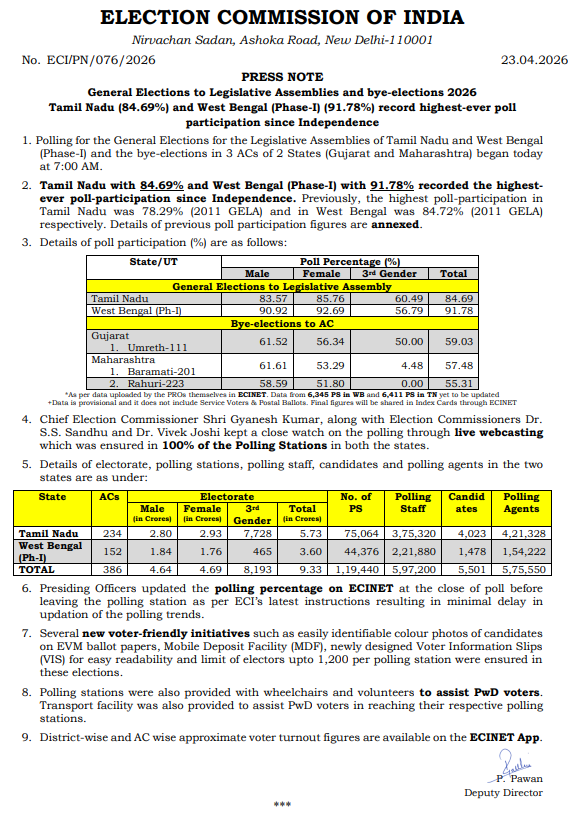 देश में लोकतंत्र का उत्सव इस बार ऐतिहासिक बन गया है। तमिलनाडु में 84.69% और पश्चिम बंगाल (पहला चरण) में 91.78% मतदान दर्ज किया गया, जो आज़ादी के बाद अब तक का सबसे अधिक मतदान है।