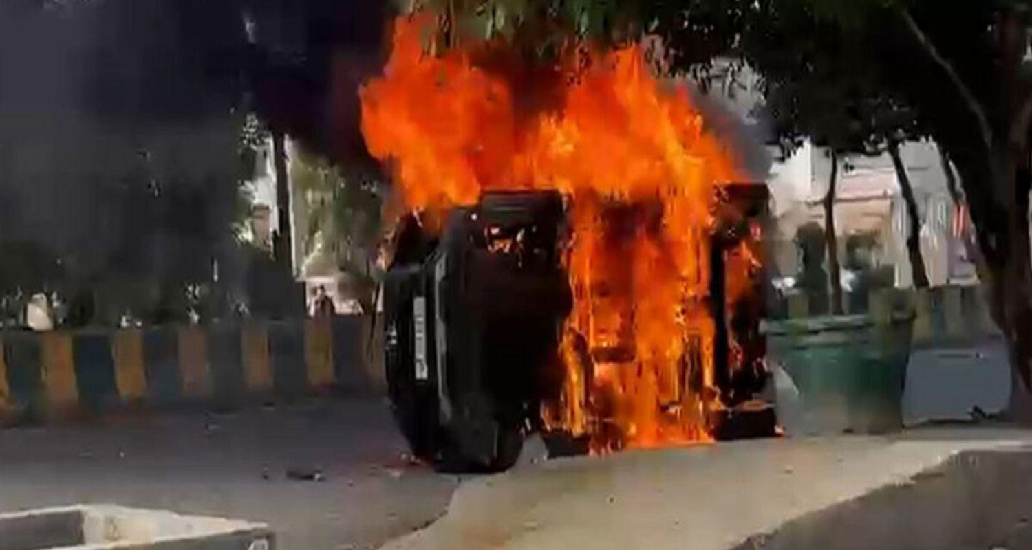 नोएडा में मजदूरों का उग्र प्रदर्शन: गाड़ियों में लगाई आग, पुलिस पर पथराव