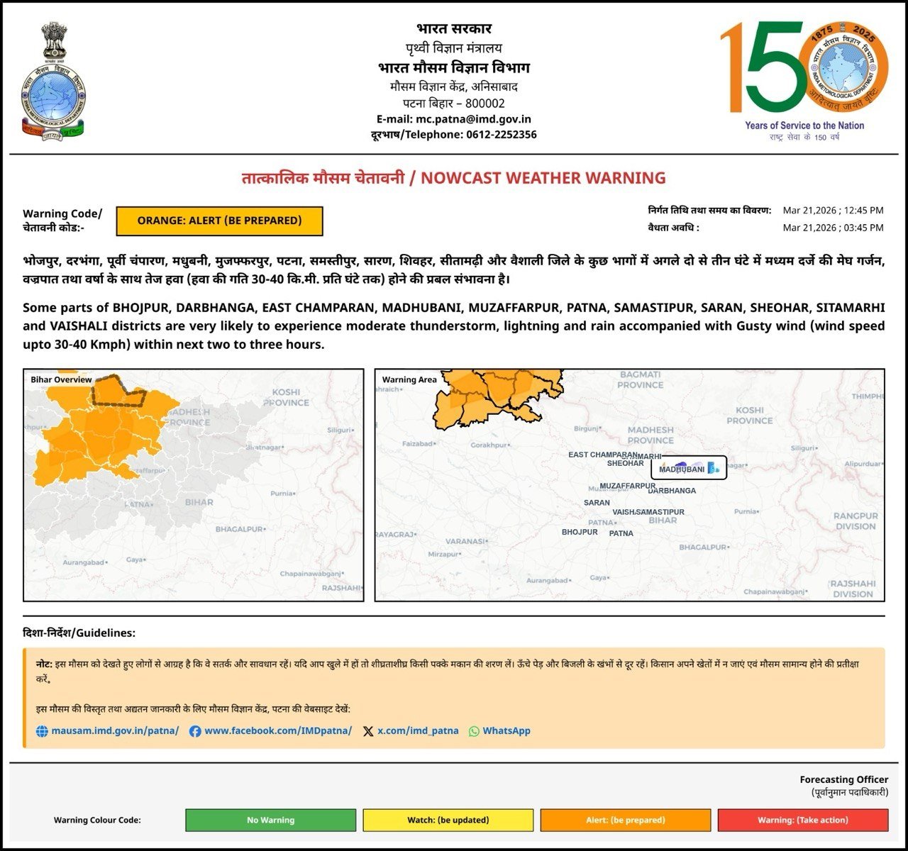 मौसम विभाग के अनुसार, अगले दो से तीन घंटों के दौरान भोजपुर, दरभंगा, पूर्वी चंपारण, मधुबनी, मुजफ्फरपुर, पटना, समस्तीपुर, सारण, शिवहर, सीतामढ़ी और वैशाली जिलों के कुछ हिस्सों में तेज हवाओं के साथ बारिश हो सकती है। इस दौरान मेघगर्जन और वज्रपात की भी संभावना है, जो जान-माल के लिए खतरा बन सकती है।