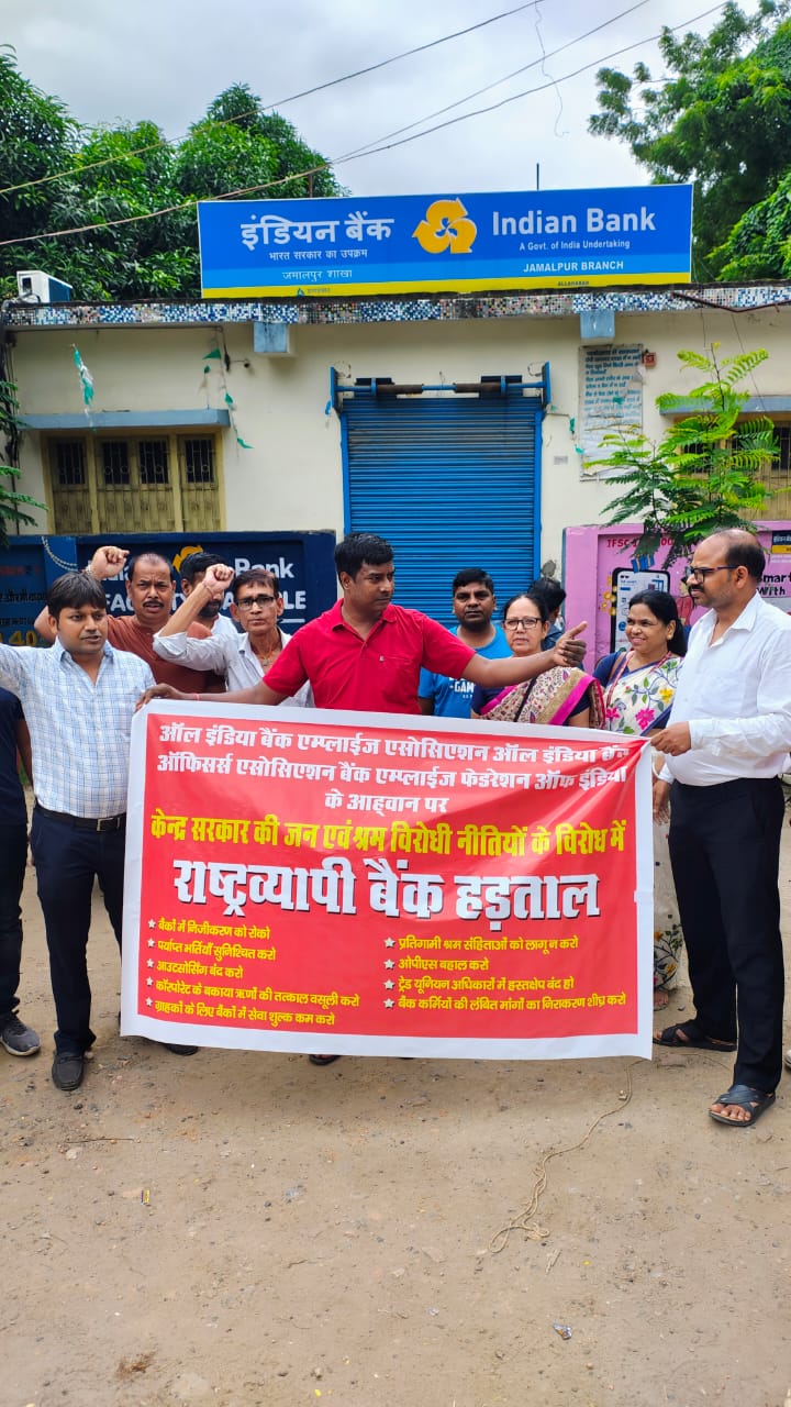 केंद्र सरकार की श्रम नीतियों और तेज़ी से बढ़ते निजीकरण के खिलाफ बुधवार को जमालपुर में बैंक यूनियनों द्वारा आयोजित एकदिवसीय हड़ताल का व्यापक असर देखने को मिला। ऑल इंडिया बैंक एम्प्लॉइज़ एसोसिएशन (AIBEA), ऑल इंडिया बैंक ऑफिसर्स यूनियन (AIBEUF) और बैंक एम्प्लॉइज़ फेडरेशन ऑफ इंडिया (BEFI) के आह्वान पर हुई इस हड़ताल में शहर के सभी बैंक शाखाएं और एटीएम पूरी तरह से बंद रहे।