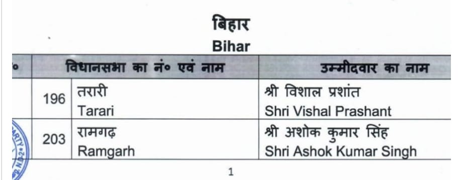 भाजपा ने अपनी हिस्से की दो सीटों – तरारी और रामगढ़ के लिए प्रत्याशी घोषित कर दिए हैं। तरारी से पूर्व विधायक सुनील पांडेय के बेटे विशाल प्रशांत को उम्मीदवार बनाया गया है। सुनील पांडेय ने हाल ही में भाजपा का दामन थामा था और तभी से कयास लगाए जा रहे थे कि उनके बेटे को चुनावी मैदान में उतारा जाएगा। विशाल प्रशांत का यह पहला राजनीतिक अनुभव होगा, और पार्टी ने उन पर भरोसा जताया है।