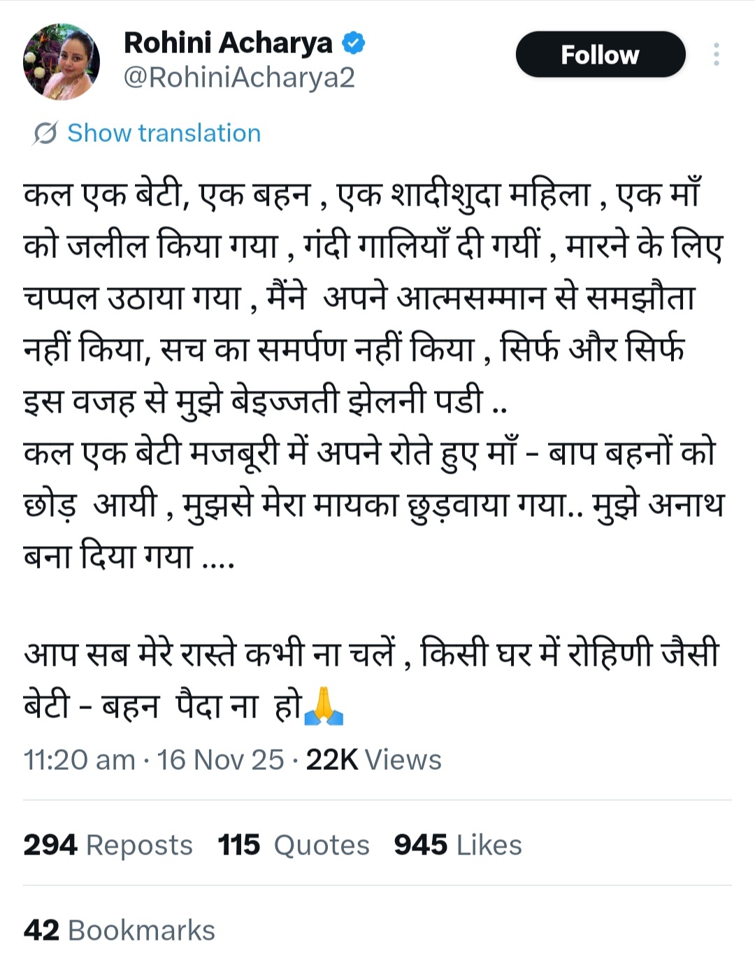 ब्रेकिंग: रोहिणी आचार्या ने X पर दर्द छलकाया, परिवार से नाराज़गी खुलकर जाहिर Post navigation रोहिणी आचार्य का बड़ा बयान गांधी मैदान में गुरुवार को शपथ लेगी नई बिहार सरकार