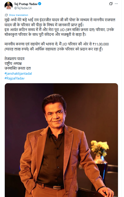 राजपाल यादव के परिजनों को 11 लाख रुपये की सहायता: तेज प्रताप यादव