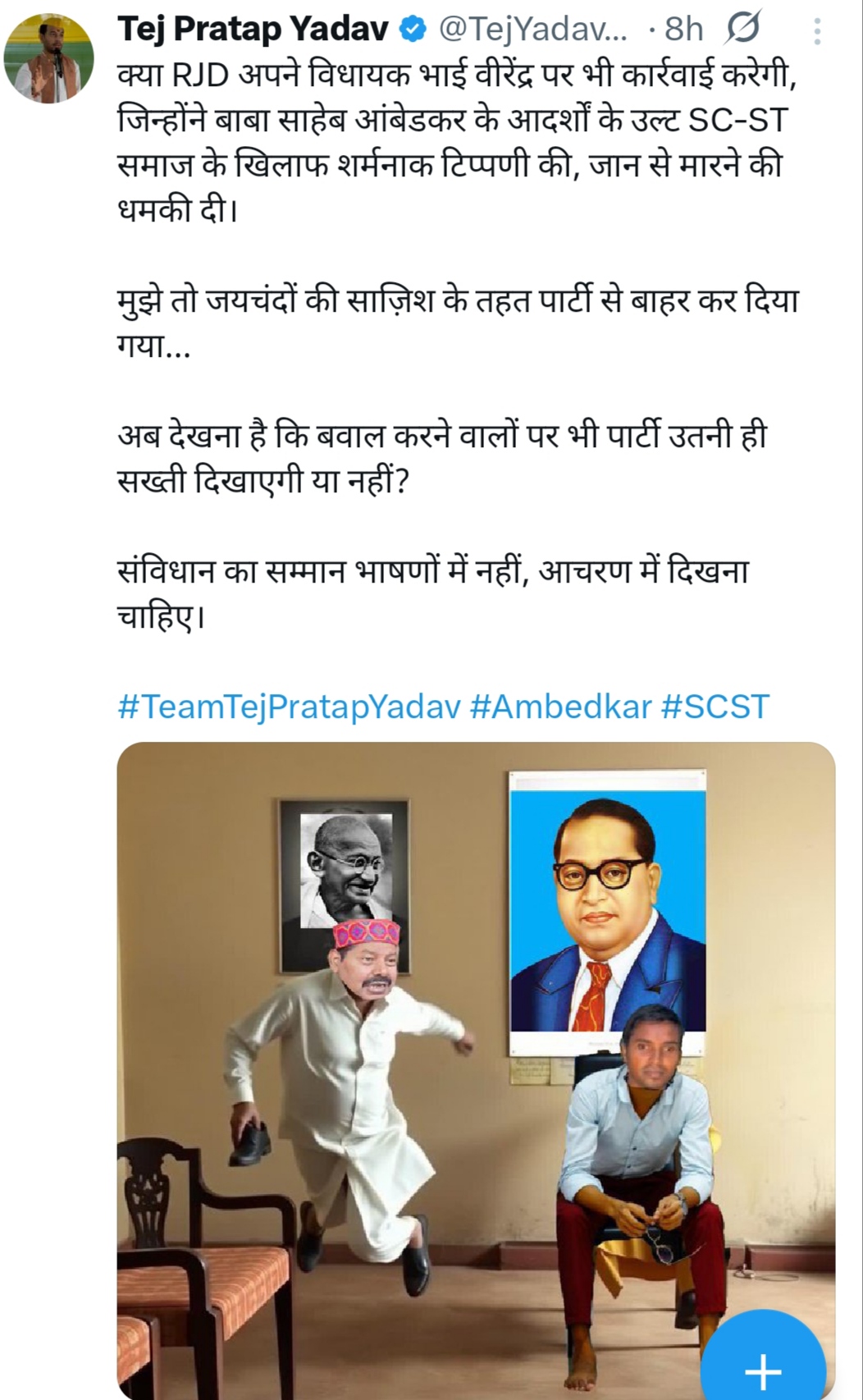 “क्या RJD अब अपने विधायक भाई वीरेंद्र पर भी वही सख्ती दिखाएगी? जिन्होंने SC-ST समाज को लेकर अमर्यादित बयान दिए, धमकी दी। मुझे तो षड्यंत्र के तहत बाहर कर दिया गया… अब देखना है कि संविधान की रक्षा करने की बात पार्टी मंचों पर करेगी या व्यवहार में दिखाएगी?”