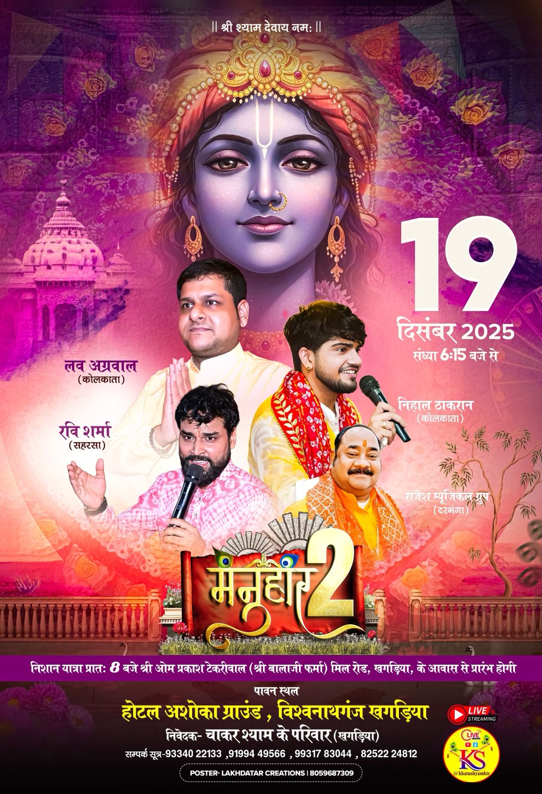 Khagaria, Bihar | The Chakar Shyam Parivar has officially announced that the much-awaited Manuhar 2 Shyam Mahotsav will be held on 19 December 2025, marking what promises to be one of the most spiritually vibrant gatherings of the year. The event will open with the Nishan Yatra, which is scheduled to begin at 8 AM from Balaji Farma, Mill Road, Khagaria.