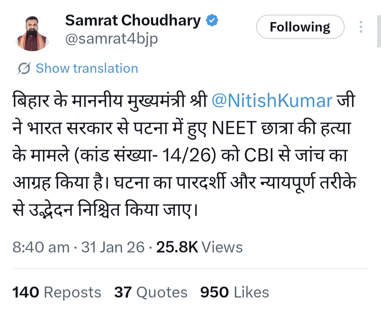NEET छात्रा हत्याकांड पर सम्राट चौधरी ने X पर दी जानकारी